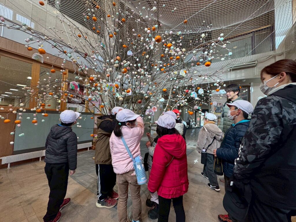巨大なヤマボウシの木にカラフルな手作り団子やみかん、リンゴ、都路小学校の児童の皆さんに塗ってもらった鯛の塗り絵などを飾りました。
